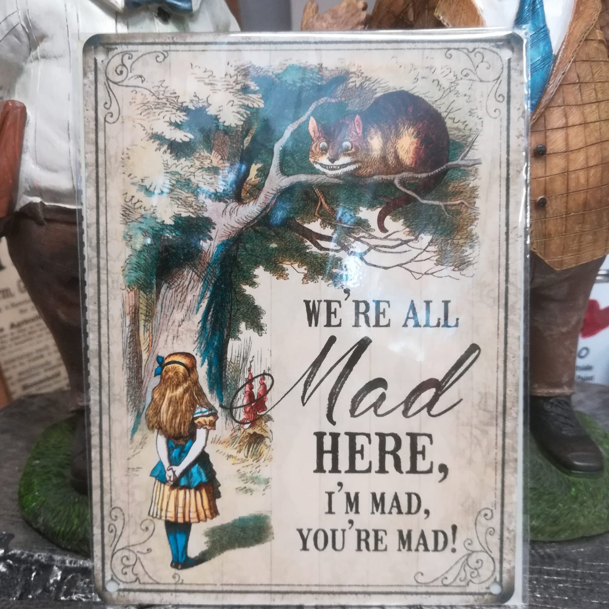 This gorgeous Alice in Wonderland We're All Mad Here Tin Sign is sure to please any Alice in Wonderland Fan. It's small but perfectly formed in lovely vintage colours featuring Alice and the Cheshire Cat.