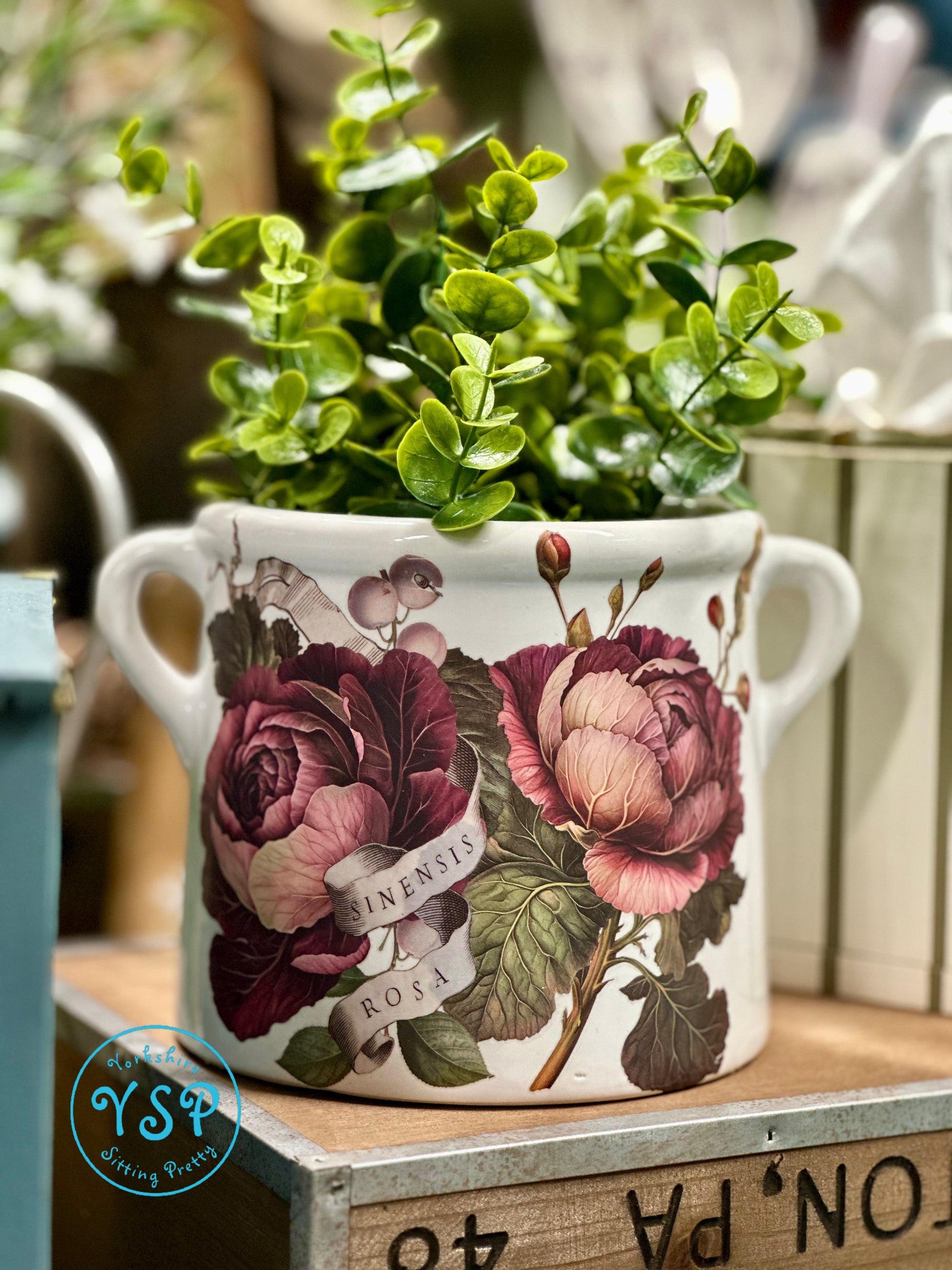 We have decorated the pot using beautiful cabbage rose transfers from Iron Orchid Designs which we have sealed for protection. There is a little tag on the back of the pot which reads 'For You' and we've added a decorative key. To give you an idea of the the pot looks when being used, we've dressed it with a faux plant.