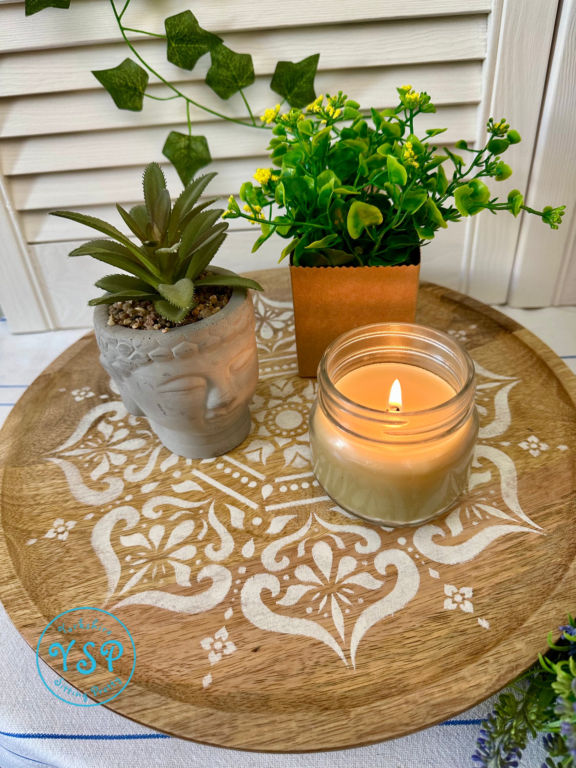 Maximise your space and style with this unique and versatile hand decorated circular wooden table riser. Decorated with a mandala pattern, it's perfect for elevating your floral and candle displays whilst instantly creating a little extra room underneath! It stands on four small legs with foam feet.