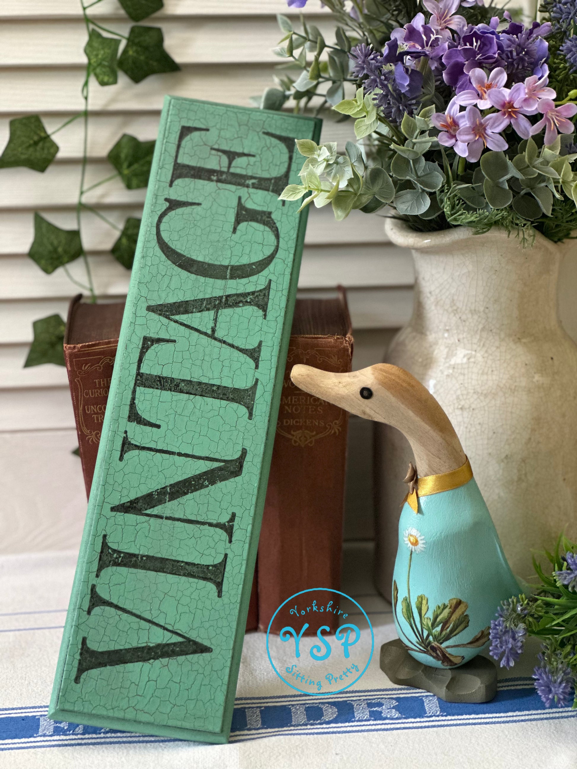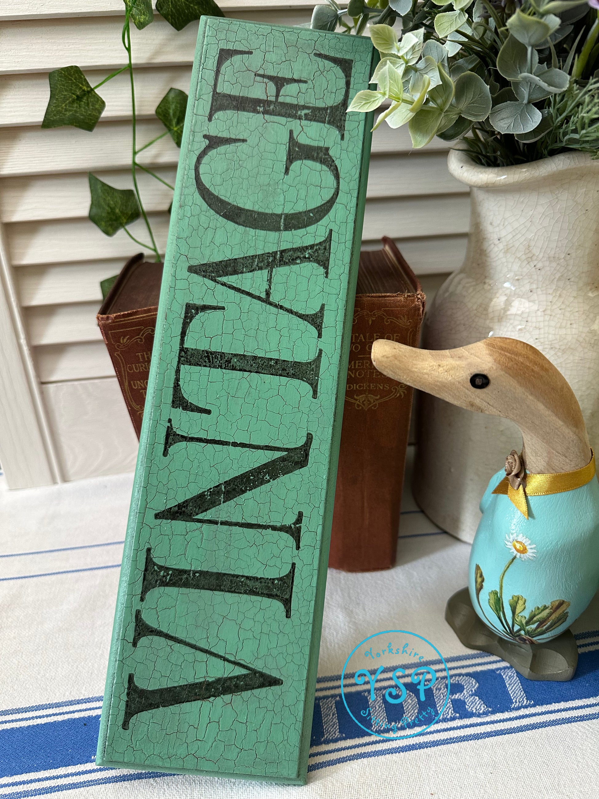 Add a touch old-world charm to your home with this hand painted and crackled Vintage sign.