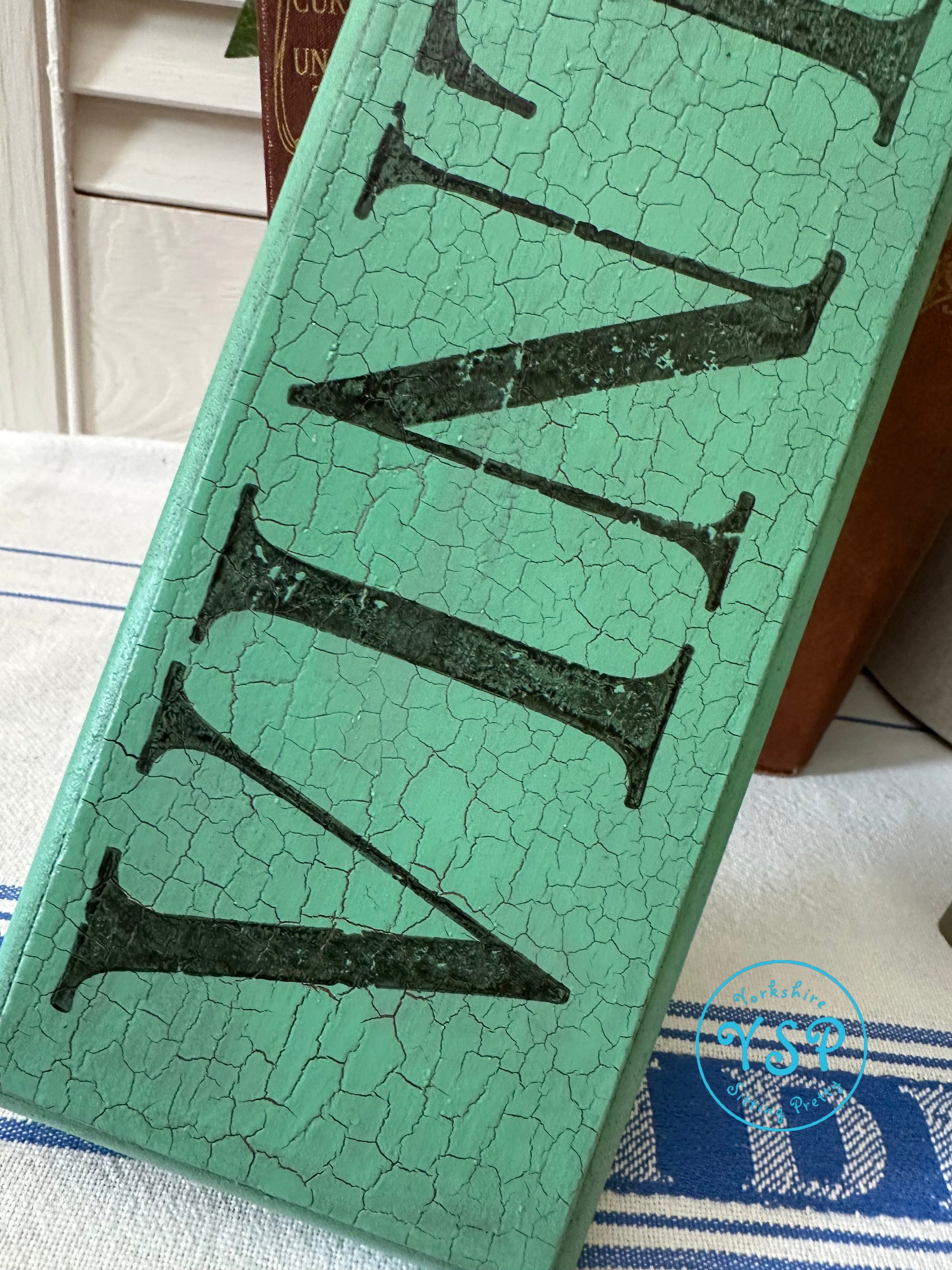 We painted the MDF black with a vibrant blue/green/turquoise milk paint and crackled. We then stamped the letters onto the sign using a black chalk paint and an Iron Orchid Designs stamp.