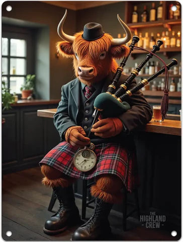 Indulge in a touch of Scottish heritage with this delightful metal sign featuring an adorable highland cow design. Perfect for whisky enthusiasts, this charming piece adds a rustic touch to any home.