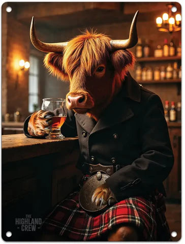 Indulge in a touch of Scottish heritage with this delightful metal sign featuring an adorable highland cow design. Perfect for whisky enthusiasts, this charming piece adds a rustic touch to any home.