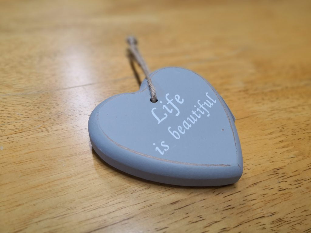 Grey Wooden Hanging Heart, inscription on both sides reads: "Life is beautiful"