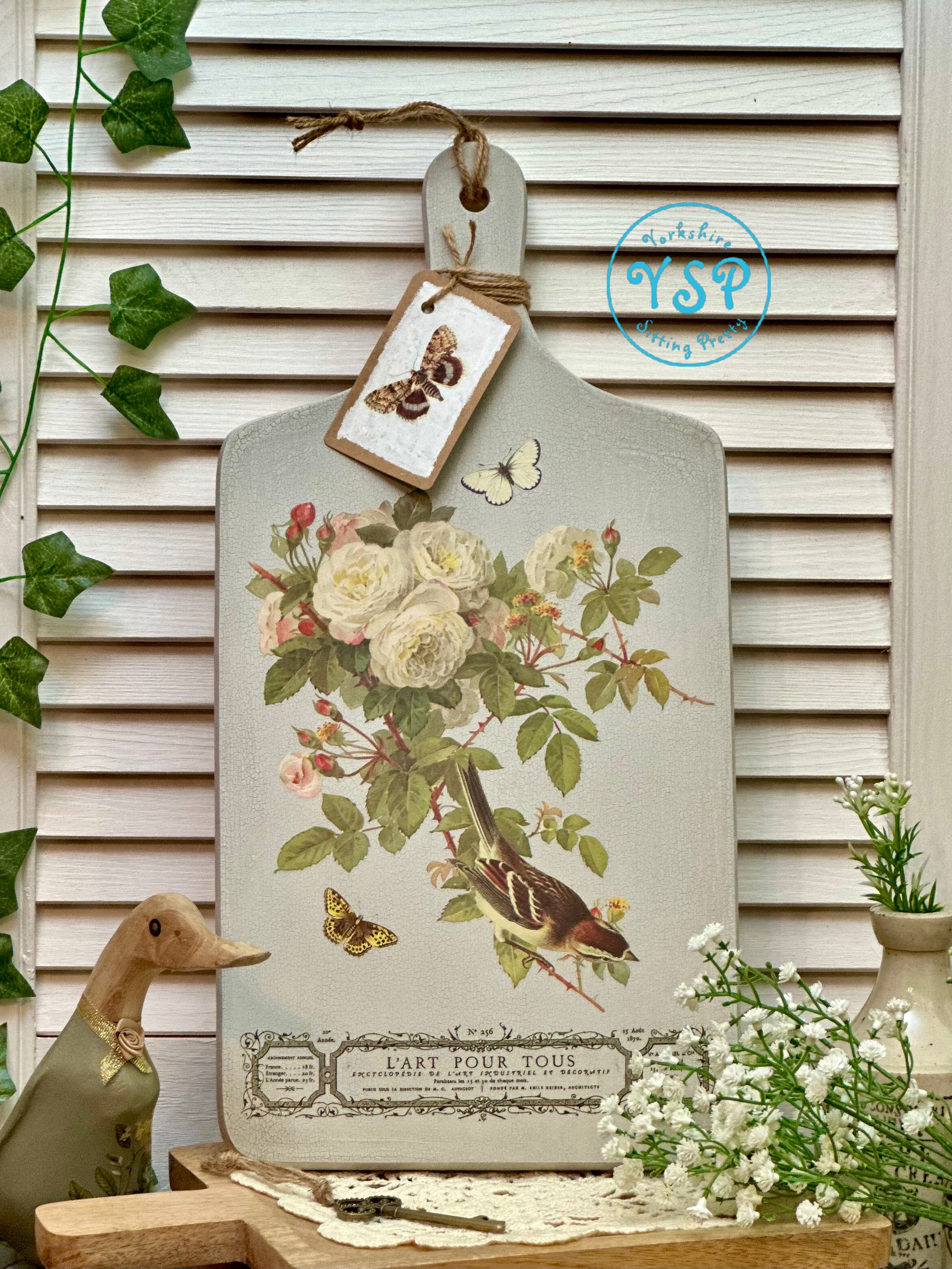 We have added some gorgeous roses from Iron Orchid Designs 'By Any Other Name' Transfer which features a sparrow, butterflies and French typography. The board has been sealed and then waxed. We've wrapped some twine around the handle of the board and have added a hand painted cardboard label featuring a butterfly.