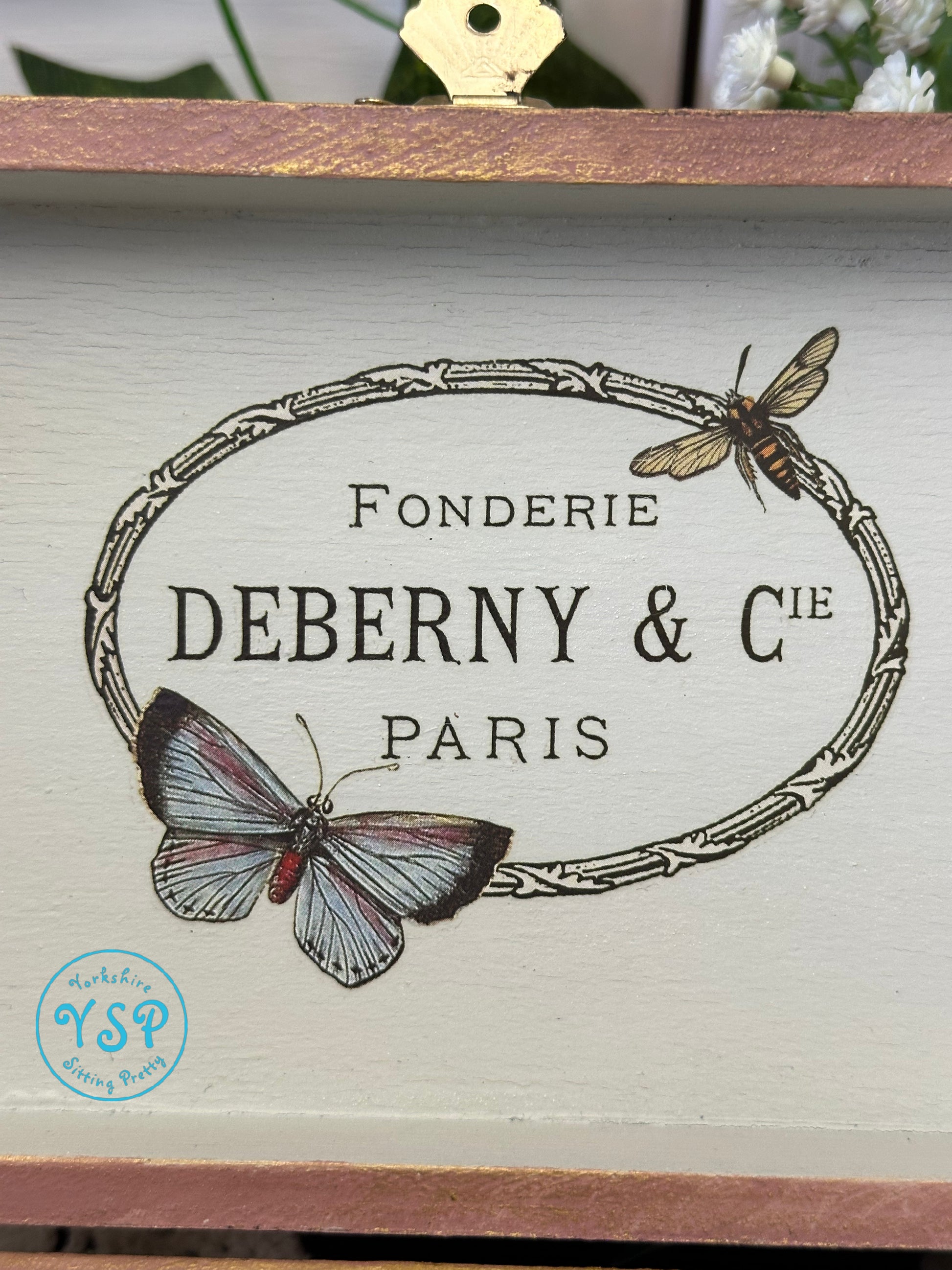 We have smothered the box in gorgeous roses and butterflies from Iron Orchid Designs 'By Any Other Name' Transfer which gives it an extra feminine feel. We've hand painted the inside of the box in a neutral light grey and added a small transfer. The box has been sealed and then waxed. We've added some little metal feet for a special finishing touch.