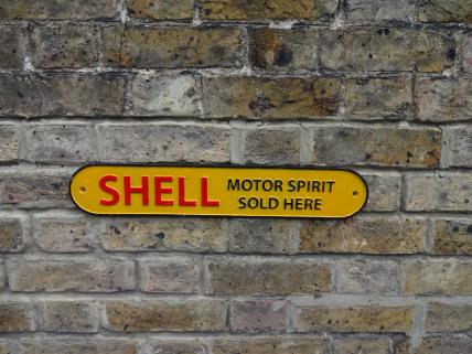 This small cast iron wall plaque bears the Shell advertising slogan "Shell Motor Spirit Sold Here". The sign is 50cm wide and is finished in handpainted red and black lettering on a brand yellow background. The lettering is raised for additional vintage effect. The sign comes with pre-drilled holes for easy hanging. Perfect for adding some automotive charm to an office, workshop or garage.