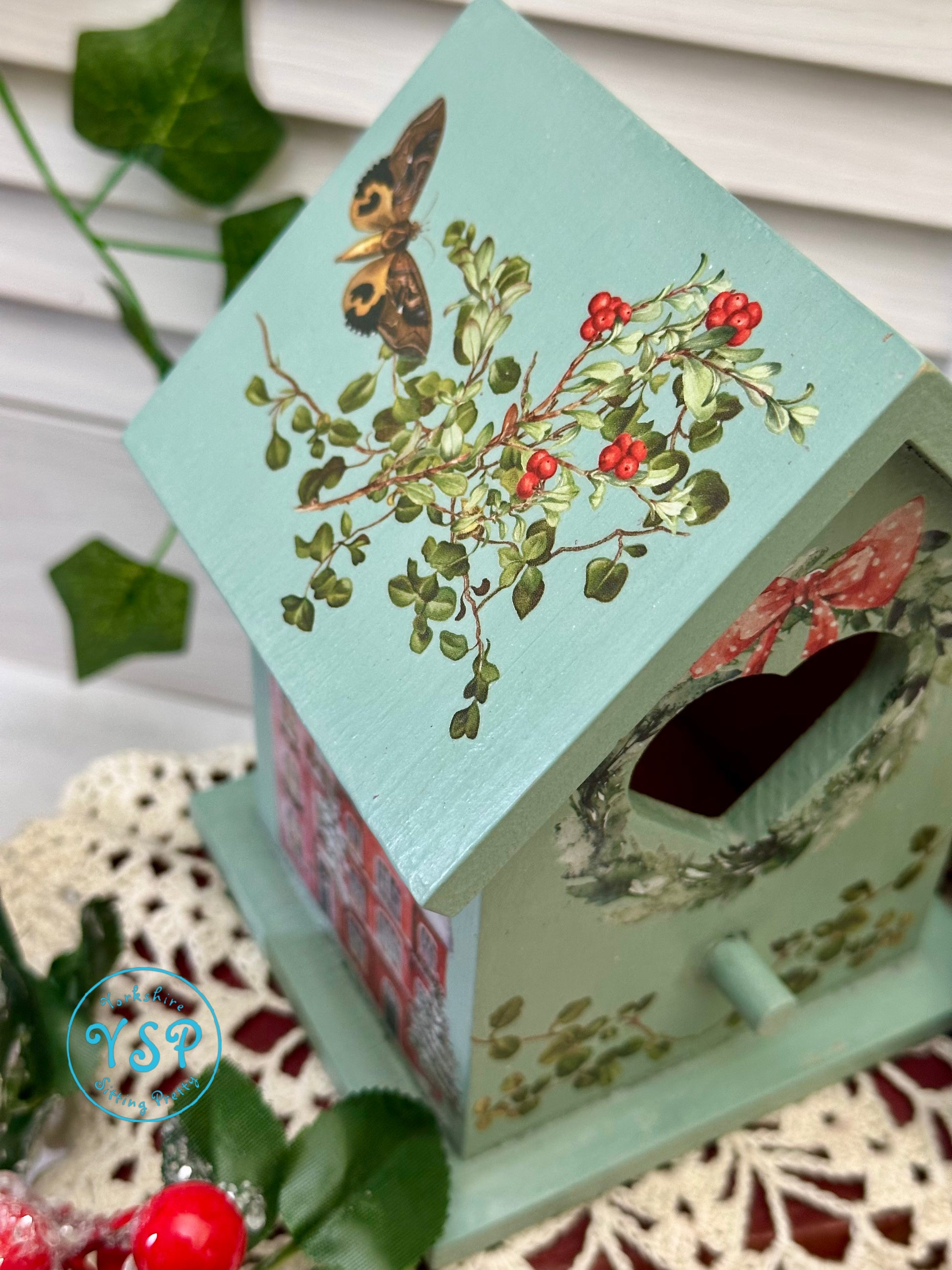 We have painted the birdhouse in a soft green/blue/duckegg milk paint and have added various different festive transfers from Iron Orchid Designs. We sealed the Birdhouse with a water based sealer and then added wax for to give the birdhouse a soft sheen.