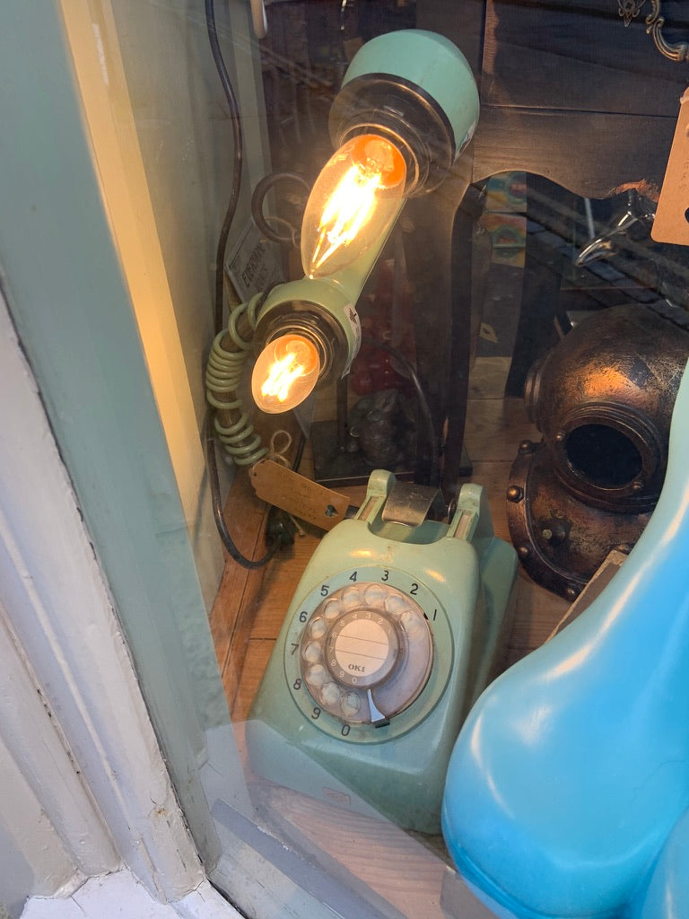 Made from real telephone parts, repurposed into a lamp. Working Dialling Mechanism.