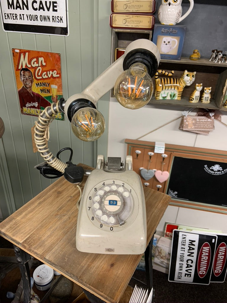 Made from real telephone parts, repurposed into a lamp. Working Dialling Mechanism.